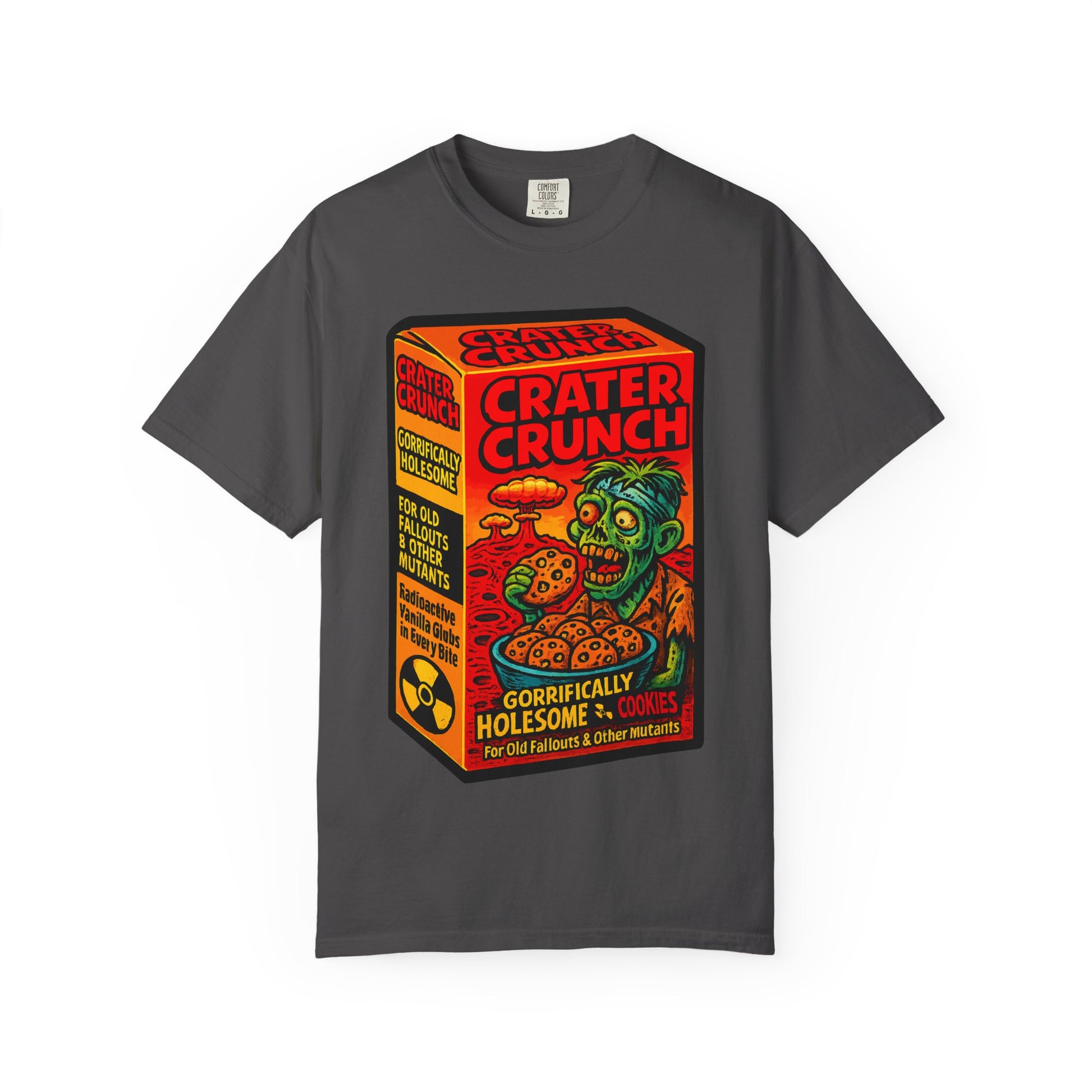 This relaxed-fit garment-dyed tee brings vintage horror-comic vibes to everyday wear. The front shows a bold, retro box labeled “Crater Crunch” with lurid reds, sickly greens, and campy skull-and-cookie artwork — a playful mash of 70s cookie art and underground poster graphics. The soft, garment-dyed cotton and medium-weight fabric give it a worn-in feel that sits easily under a jacket or on its own. Wear it to late-night shows, record swaps, or low-key hangouts to lean into a tongue-in-cheek, offbeat aesthetic that starts conversations without trying too hard.